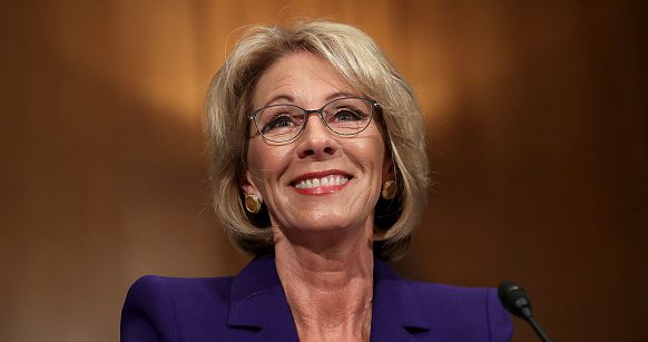 WASHINGTON, DC - JANUARY 17: Betsy DeVos, President-elect Donald Trump's pick to be the next Secretary of Education, testifies during her confirmation hearing before the Senate Health, Education, Labor and Pensions Committee in the Dirksen Senate Office Building on Capitol Hill January 17, 2017 in Washington, DC. DeVos is known for her advocacy of school choice and education voucher programs and is a long-time leader of the Republican Party in Michigan. (Photo by Chip Somodevilla/Getty Images)