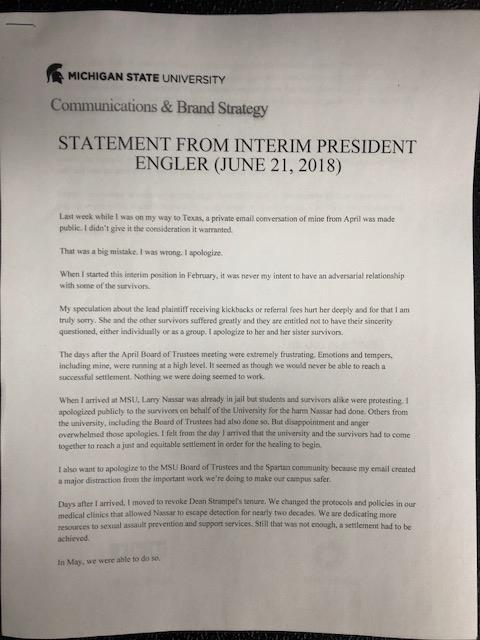 In his Thursday statement, Engler said when he started as president in February he never meant to have an adversarial relationship with some of Nassar's victims. He said his speculation about Denhollander "hurt her deeply," and other survivors "suffered greatly."