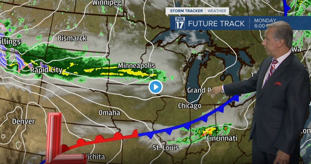 GRAND RAPIDS — WEST MICHIGAN — The forecast from FOX 17 Chief Meteorologist Kevin Craig: A potent low-pressure system and cold front will swing through the state overnight into Monday morning. Rain and strong to severe thunderstorms are possible Sunday overnight. Large hail and damaging straight line winds are the primary threats, with heavy rain and vivid lightning also possible. We remain in a "SLIGHT RISK" for severe weather development. Some of these storms may trigger a Severe Thunderstorm warning. The threat diminishes by early Monday morning. More rain/storms are likely on Tuesday. In fact, this week in general will be on the cooler side. Normal highs have us in the mid/upper 70s, we expect 60s and lower 70s. Have a pleasant week.