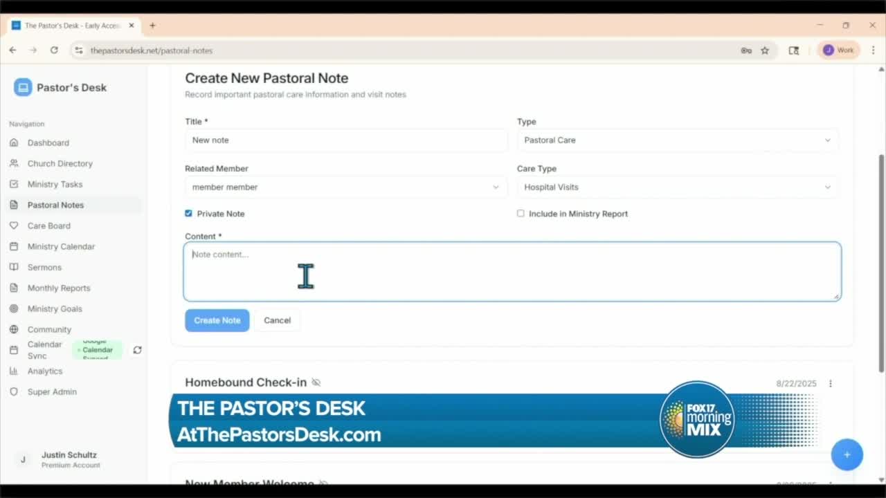 A new ministry software, "The Pastor's Desk", helps churches of all sizes ensure that there is a one-stop shop for pastoral needs. Created by lead pastor of Nashville Church of the Nazarene Justin Schultz, The Pastor's Desk features easy-to-access resources for pastoral staff, such as sermon organization, outline builders, illustrated resources, annual report construction, pastoral care resources, and more. It can also be used to manage a church's directory and have other pastors connect with other church leaders.