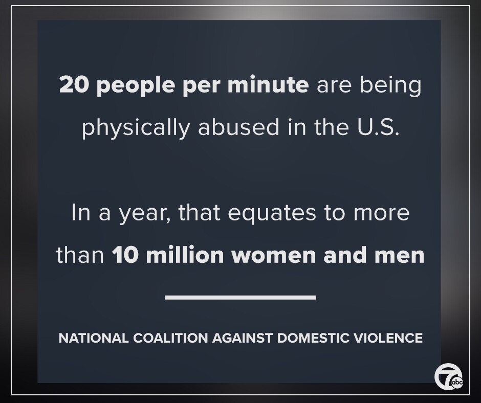 Statistics from the National Coalition Against Domestic Violence show an average of 20 people per minute are being physically abused in the U.S. In a year, that equates to more than 10 million women and men.