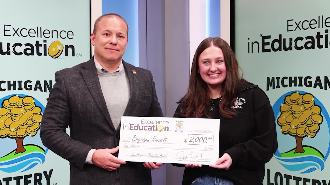 Bryeana Rinvelt from Inland Lakes Secondary School has received a $2,000 check from the Michigan Lottery.