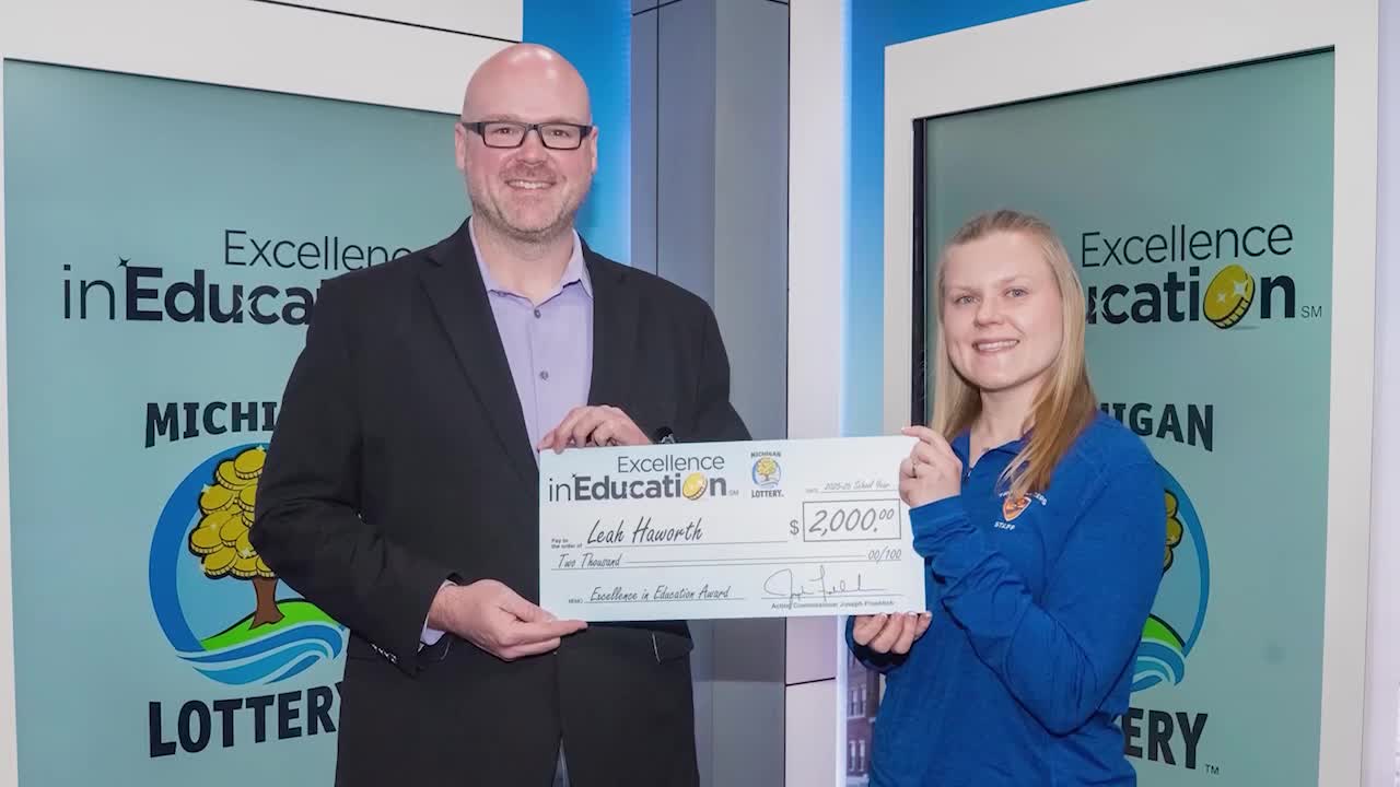 Leah Haworth from Douglas Elementary has received a $2,000 check from the Michigan Lottery.