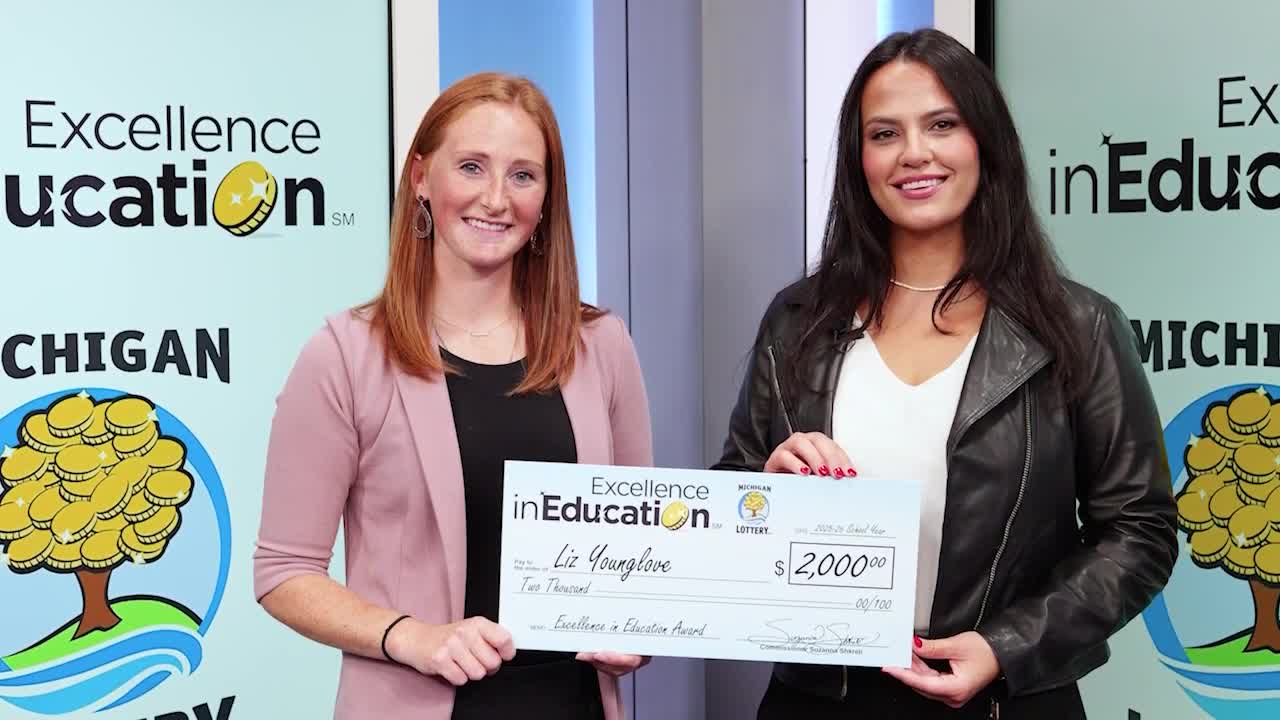 Liz Younglove from Pine River Area Elementary has received a $2,000 check from the Michigan Lottery.