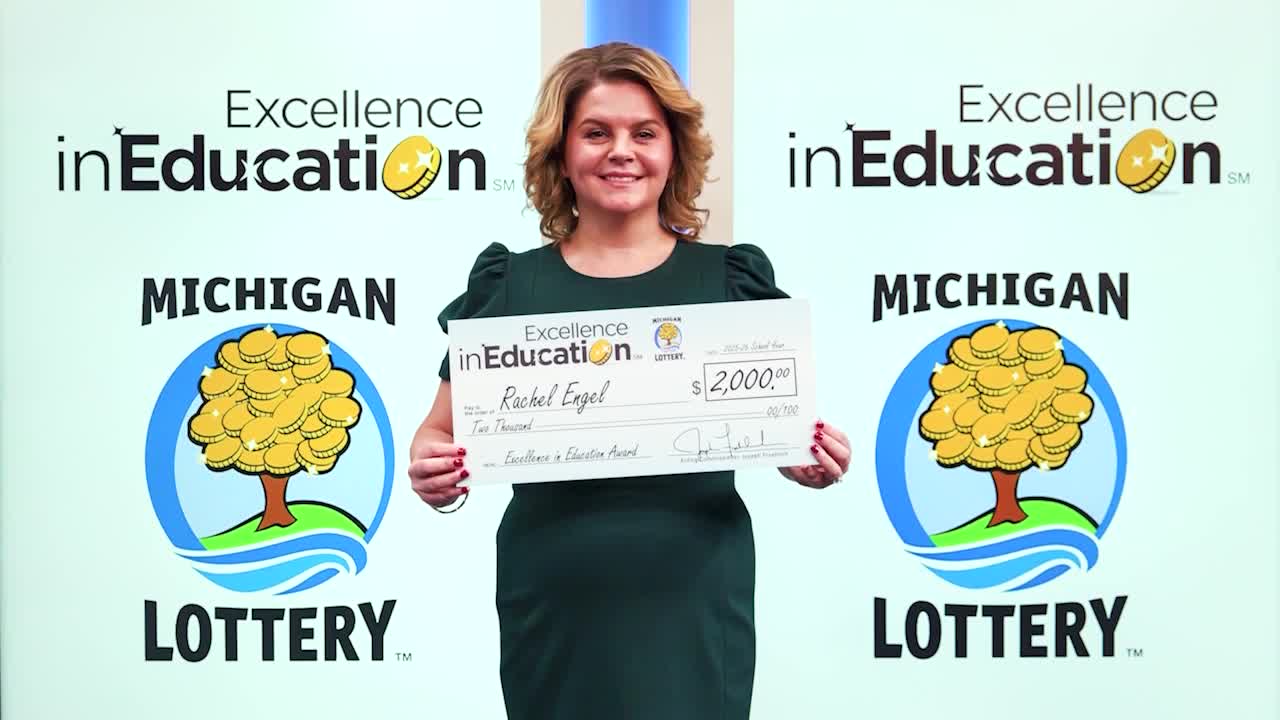 Rachel Engel from Schoolcraft Elementary has received a $2,000 check from the Michigan Lottery.