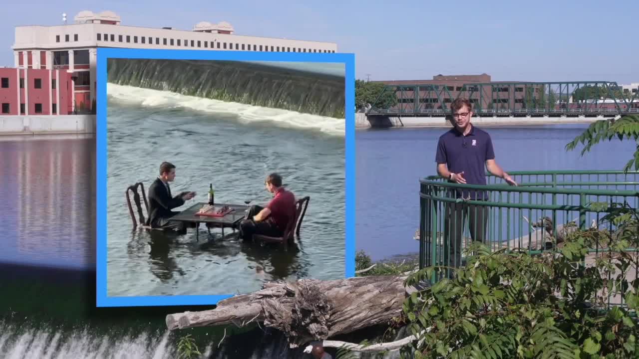 A few Fridays ago, Siroonian texted Grwinski a photo of a metal table in the middle of the Grand River in downtown Grand Rapids, placed there by a local fisherman.