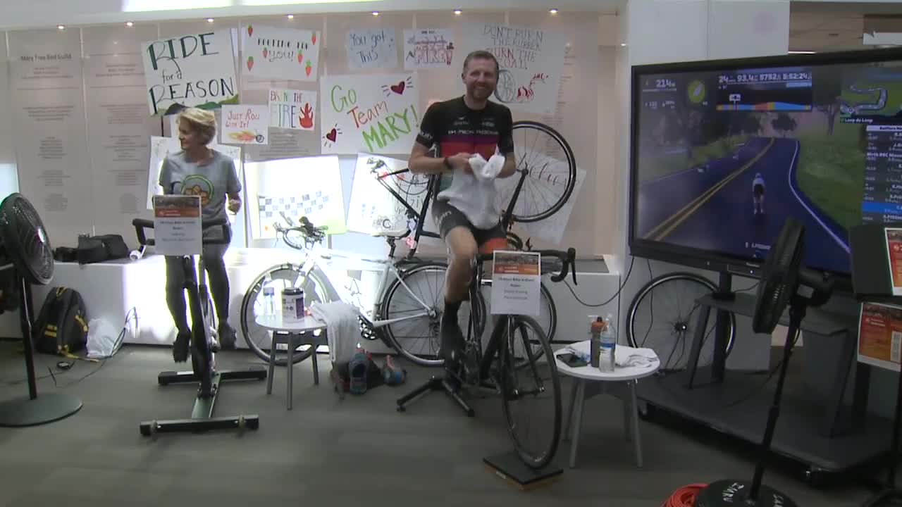 GRAND RAPIDS, Mich. — Staff at Mary Free Bed Rehabilitation Hospital in Grand Rapids rode stationary bikes for 10 hours straight in their main lobby to raise awareness for the Gran Fondo cycling event.