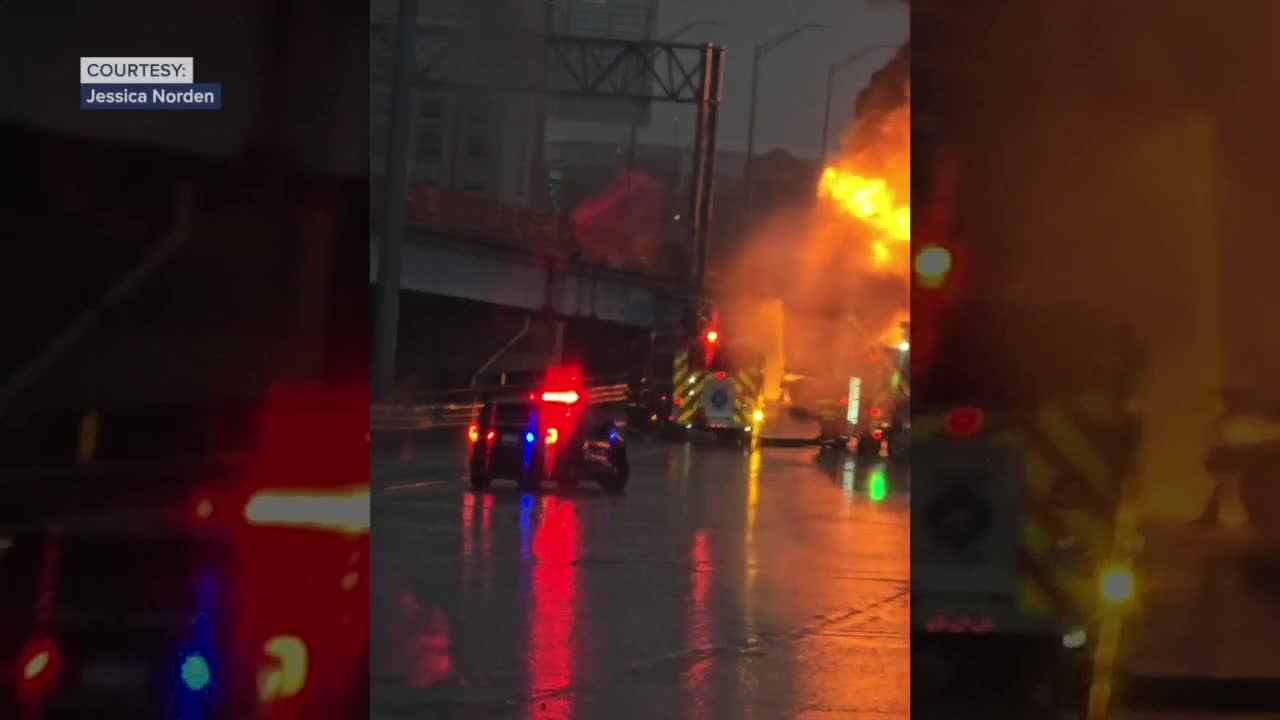 A semi-truck carrying 8,000 gallons of gasoline and another semi-truck crashed near the Pearl Street exit ramp, sparking an explosion and fire.