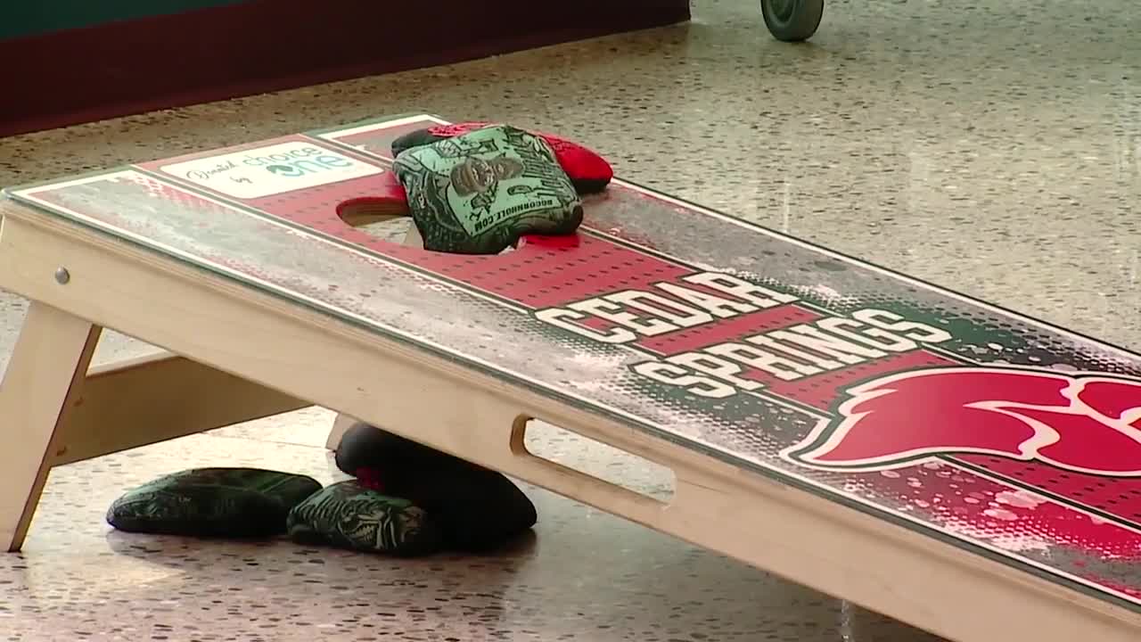 CEDAR SPRINGS, Mich. — While most high school sports involve balls or pucks, the Cedar Springs Red Hawks have embraced a different kind of competition using bean bags and slanted boards with holes.