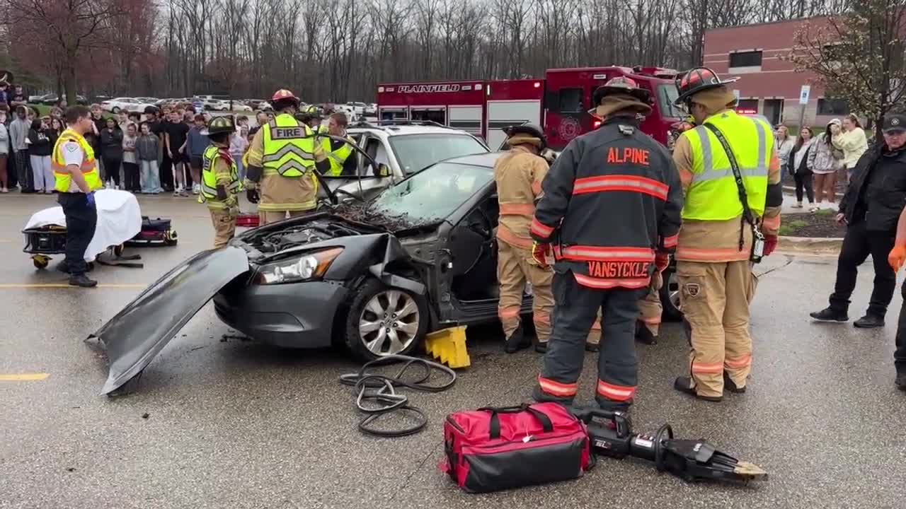 WALKER, Mich. — Comstock Park High School transformed its parking lot into a sobering scene Wednesday afternoon—staging a realistic car crash demonstration to drive home the deadly consequences of distracted driving.