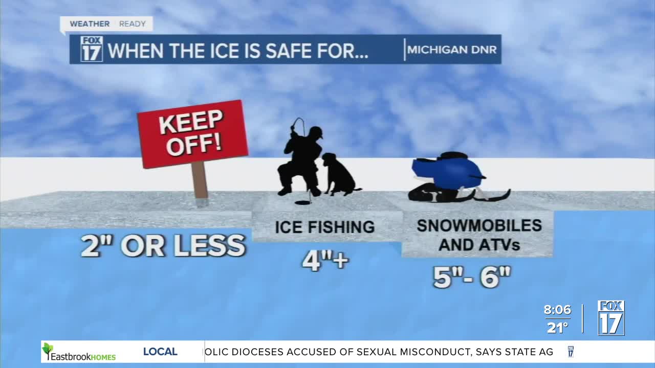The Michigan Department of Natural Resources recommends staying off ice that is 2 inches or less in thickness, and at least 4 inches is needed to walk on.