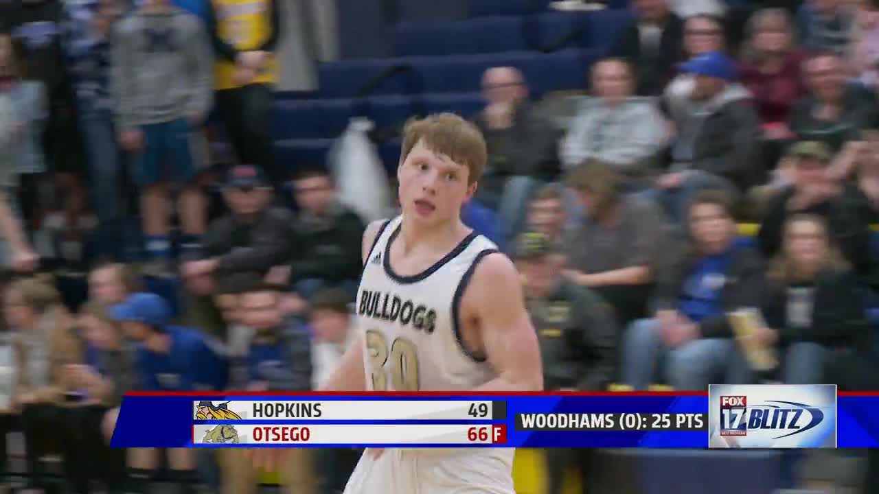 Charlie Woodhams had 25 points as Wolverine champion Otsego beat OK Silver co-champ Hopkins.