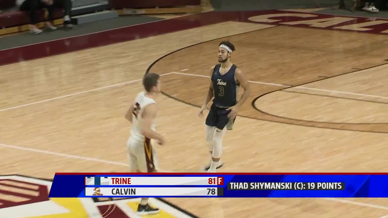 GRAND RAPIDS, Mich. — The Calvin Knights were unable to extend a two game winning streak on Saturday, falling to Trine, 81-78 at home. Thad Shymanski scored a team-high 19 points for the Knights while Derrick DeVries scored 18 and Tony DeWitte added 12. The Knights fall to 8-7 overall and 2-2 in MIAA play.