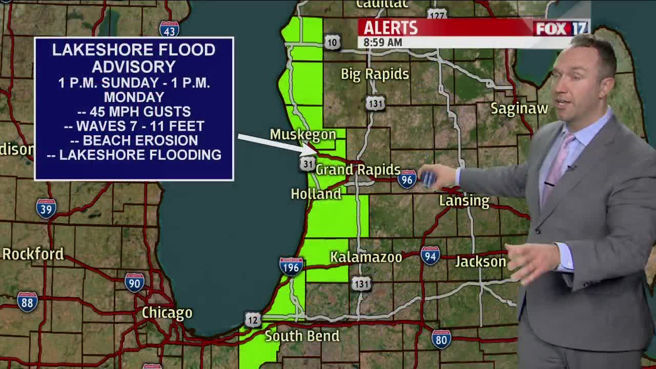 Mostly cloudy weather carries through this evening and overnight with lows around 30 degrees. Northwest winds relax tonight for inland locations to between 5-10 mph while continuing on the breezy side for immediate Lakeshore locations. We look for more clouds on Sunday along with winds ramping up as a clipper-like system passes to our north through southern Ontario. South winds at the start tomorrow shift to the southwest and then the west into the afternoon while increasing to 15-25 mph gusting to 30-40 mph. Lakeshore communities will feel the brunt of the winds gusting to around 45 mph or so on Sunday. A Lakeshore Flood Advisory goes into effect on Sunday at 1 P.M. and lasts until 1 P.M. Monday for all of our lakeshore counties. Waves are expected to build to between 7-11 feet. More beach erosion will occur and more low-lying flooding will be possible. A few light snow and/or rain showers will be possible mid-late morning into the afternoon but accumulations are not a concern. Temperatures rise into the mid to upper 30s to wrap up the weekend.