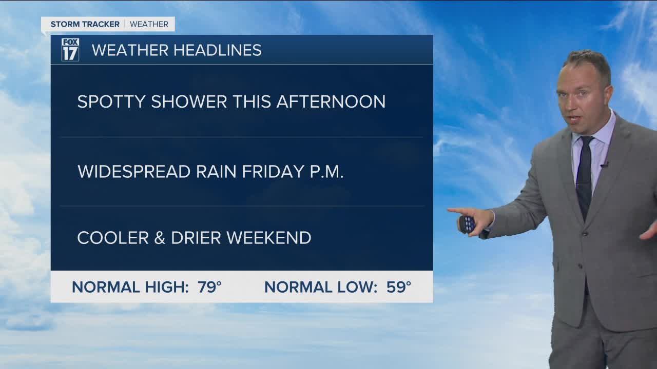 Even though the best chance of storms becoming severe will be Friday evening, any storm now through the end of Friday could be strong. Any watch or warning will be brought to you on FOX17 social media and on-air. If a storm does turn severe, it could produce damaging wind gusts, large hail, frequent lightning and flooding rain. With the warm front in the area Friday evening, an isolated tornado will be possible then.