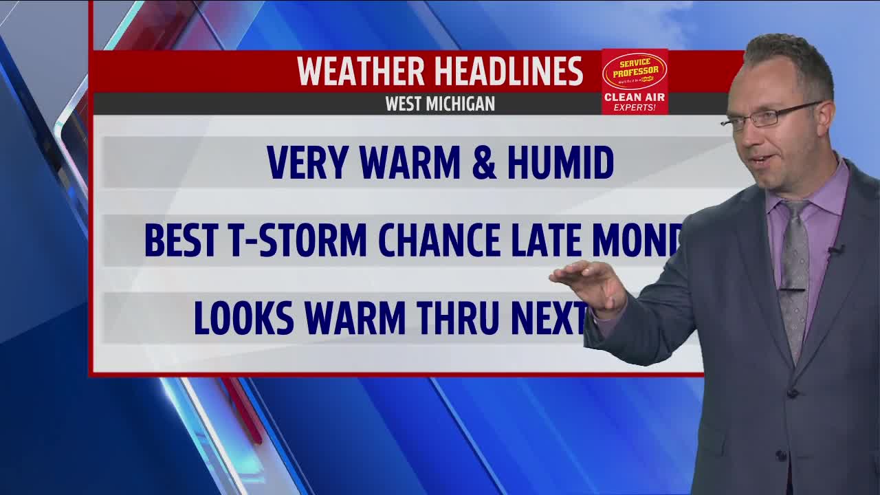 WEST MICHIGAN — A much warmer and more humid afternoon is expected here on Sunday across West Michigan. Partly cloudy skies can be expected throughout the day. Look for high temperatures to hit the upper 80s by day's end.