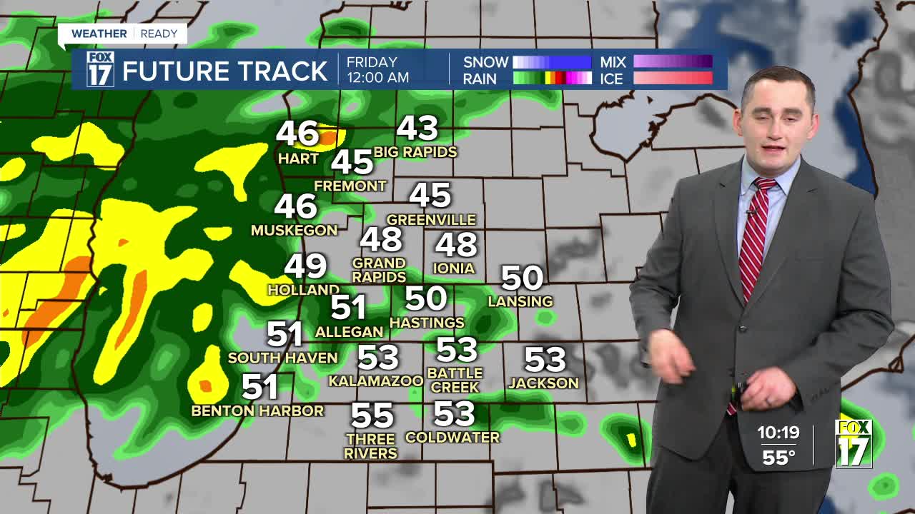 The forecast from FOX 17 Weather Ready Meteorologist Kara James: The warmup continues through the rest of the week, even as a cold front passes through early tomorrow morning! Rain develops after midnight as the front gets closer, with lows in the upper 40s. It will be breezy overnight with south winds gusting 25 to 30 mph. Rain ends around noon Thursday, with sunshine in the afternoon and highs in the upper 50s. Another round of rain comes late Thursday night into Friday with rain totals around 1/2" to 1". Saturday will be the best day of the week to be outside, with sun and highs in the upper 50s (near average). More unsettled weather is likely Sunday into early next week, with rounds of rain and a few thunderstorms as highs push 70 or better. Keep an eye on any rivers, streams, or creeks near your home. FLOOD WARNINGS for high river levels continue along the entire Grand River from Robinson Township to Ionia, the Muskegon River in Newaygo County, and the Thornapple River in Barry County. Click here for the latest river flood information from the NWS.
