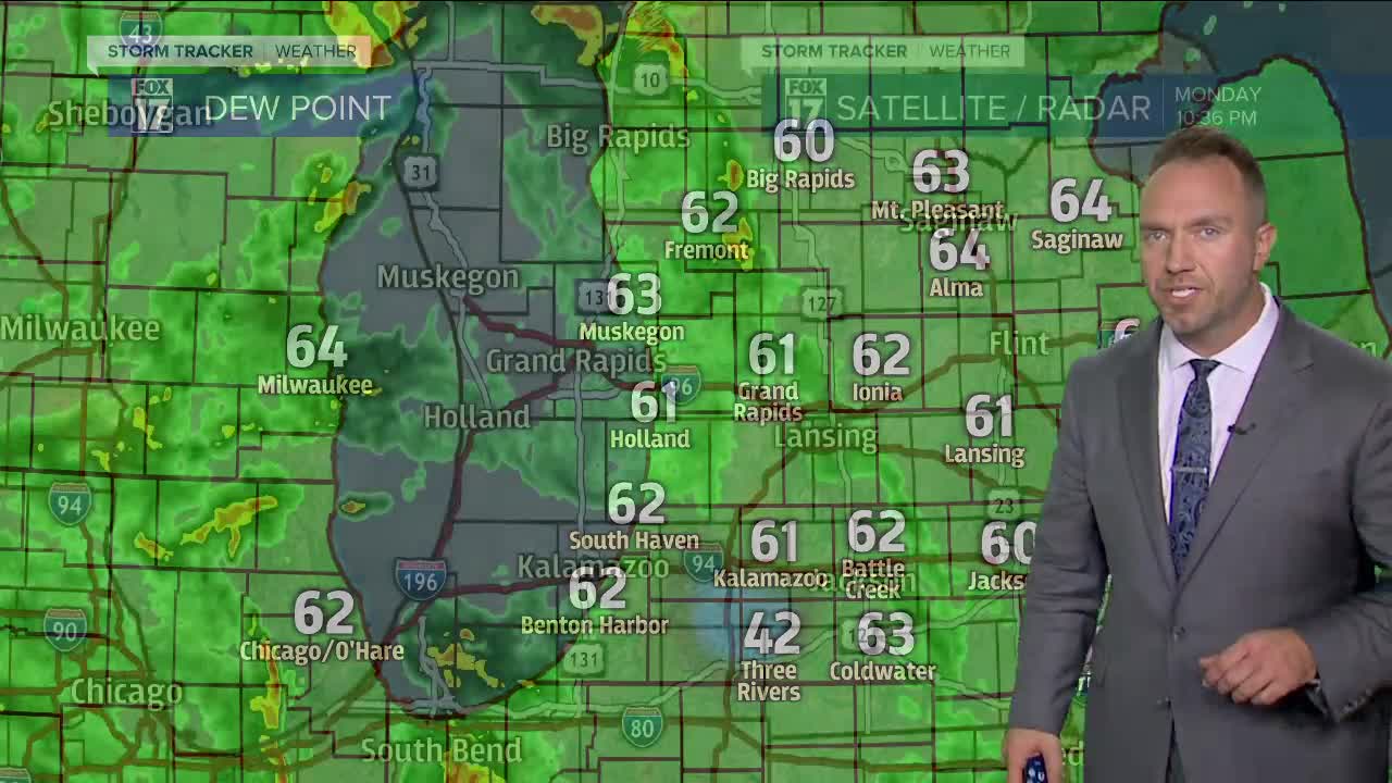 WEST MICHIGAN — The forecast from FOX 17 Meteorologist Anthony Domol: Quiet conditions will be with us late this afternoon and early evening with clouds thickening up as we go along. Widespread showers and thunderstorms are anticipated after 7/8 P.M. Locations west of US-131 currently fall under a slight risk for severe weather. The potential threats include damaging winds, heavy rain, and hail. While the threat is very low, the possibility of an isolated tornado exists. Download the FOX 17 Weather App for immediate severe weather updates. Cooler air works in behind this system for Tuesday with readings topping out in the middle 60s along with some lingering scattered showers mainly in the morning. A warmer phase is in store again for Tuesday and Wednesday before temps drop off for this coming weekend.