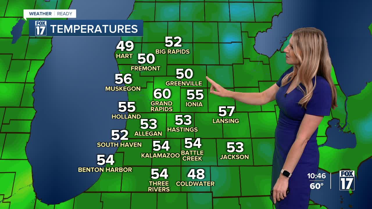 WEST MICHIGAN — The forecast from FOX 17 Weather Ready Meteorologist Kara James: Unseasonably cool air continues flowing into the Great Lakes tonight. Overnight will be chilly in the mid-40s, feeling like late September or early October. Tomorrow will be the warmest day of the week in the mid 70s, but still below average. Average highs this time of year are near 80 degrees. Mornings will also be on the cooler side-upper 40s to mid 50s the next several days. Open those windows overnight! A cold front dropping in from Canada early Thursday morning brings the best chance of rain for the week, with around a quarter inch expected areawide. Rain ends by the early afternoon, so no trouble for high school football games Thursday evening! Temperatures slowly moderate Friday into the holiday weekend, with highs back in the mid to upper 70s and dry conditions. Stay tuned to the FOX 17 Weather Ready Team for your latest forecast updates.