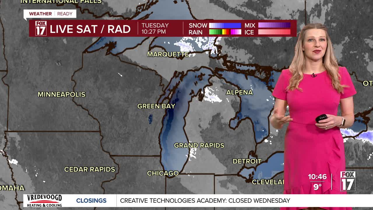 WEST MICHIGAN — From Fox 17 Weather Ready Meteorologist Kara James: After a very snowy start to the day with gusty winds, low visibility and occasional whiteout conditions, snow showers will become a little less widespread this evening and overnight. The WINTER WEATHER ADVISORY continues until 10 a.m. Wednesday for Ottawa, Allegan, Van Buren, Kalamazoo, Berrien, Cass and St. Joseph counties. Snow totals will be minimal, but continued gusty winds and blowing snow will keep low visibility and slick roads a main concern. Wind chills will be below zero but not as cold as last night, with most around -10 to -5. The overall pattern remains much colder than average all week with lows remaining in the single digits, highs mainly in the teens, and occasional snow showers each day. The pattern shifts a little bit starting this weekend, with lower snow chances, highs in the 20s and a peek of sun or two possible.