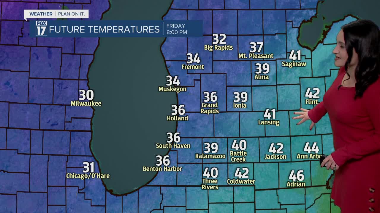 WEST MICHIGAN — The forecast from FOX 17 Meteorologist Haleigh Vaughn: Warm temperatures are in the forecast tonight and into early Friday morning before cooler air sweeps in Friday afternoon. Don't forget your rain jacket as you step out the front door! There's a chance for rain showers all day on Friday, with the majority of showers lining up south and east of Grand Rapids. While no significant flooding is expected, it is still a good practice to make sure storm drains are cleared of snow and ice, so melting water has a place to go. Take it easy while traveling as roads are expected to be slick and slushy at times. There are additionally concerns for ice jams on local rivers. Skies dry up and clouds hang around for Saturday (New Year's Eve) with temperatures rising to near 40 degrees. Sunday (New Year’s Day) brings a small chance for a few light rain showers with some snowflakes mixed in at times, primarily in the morning. Another system bringing rain showers develops overnight Monday, lasting into Tuesday and early Wednesday. Based on extended outlooks, warmer-than-average temperatures are likely to hang around through the first week of January. Stay tuned with the FOX 17 Weather Team for updates. Download the free FOX 17 Weather App for the latest forecast video.