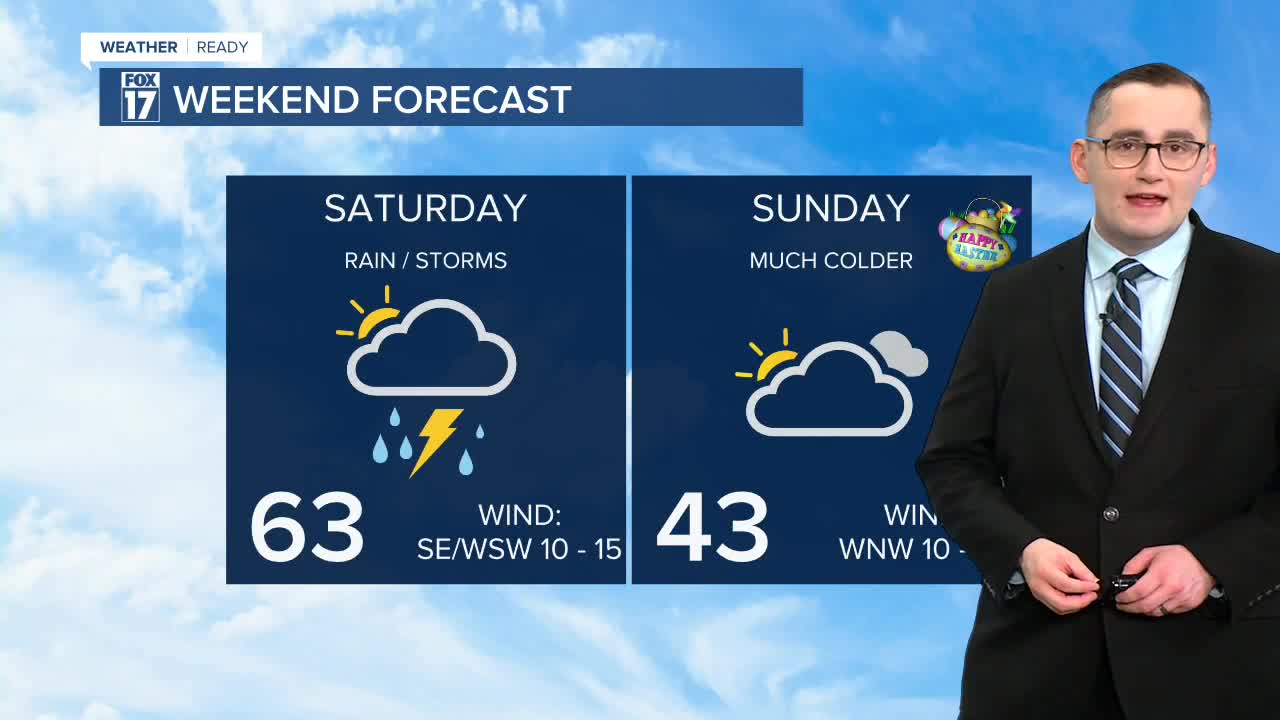 The forecast from FOX 17 Weather Ready Meteorologist Colton Cichoracki: After a day with rain and storms on Thursday, we will see a break in the action today but it will be short-lived as another system comes in overnight. To wrap up the week, mostly cloudy skies are expected with a few breaks in the clouds in the afternoon. Temperatures today will be largely in the 50s. Overnight, after midnight, rain and storms will move into West Michigan. Lows are in the middle 40s. On Saturday, showers and thunderstorms are likely as well but it should end in the afternoon. Temperatures will be in the lower 60s. Rainfall totals through Saturday could be around another inch. For Easter Sunday, we will be mostly dry outside of a flurry or sprinkle. Highs will be in the lower 40s. Next week, a weak system could bring a few rain/snow showers Monday but a warm-up is coming by the end of the week.