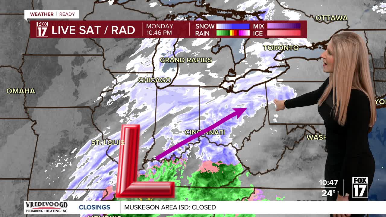 WEST MICHIGAN — From Fox 17 Weather Ready Meteorologist Kara James: After a snowy and cold weekend, another system is working through West Michigan, bringing more snow! Most will end up with a widespread 1-2" of snow through Tuesday morning, but heavy lake effect snow is impacting portions of the lakeshore, where totals could add up to a foot! A WINTER STORM WARNING runs through 7 a.m. Tuesday for Muskegon, Oceana and Ottawa Counties to account for the heavy lake effect. A WINTER WEATHER ADVISORY is in effect for Newaygo County for upwards of an additional 6-inches of new snow. Expect widespread travel disruptions along the lakeshore, with slick spots across the rest of West Michigan. The overall pattern remains unseasonably cold and active this week, with several periods of snow possible (Wednesday, this weekend, early next week). It will also get much colder come late week, with highs only in the low 20s.