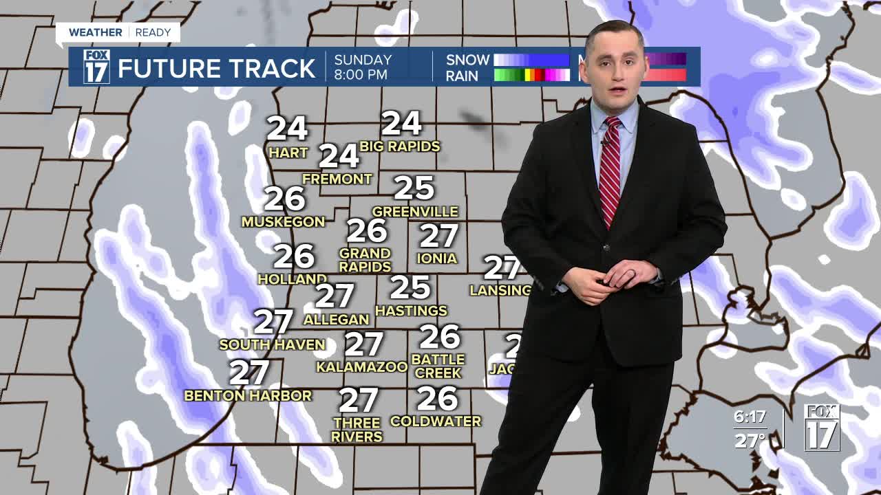 The forecast from FOX 17 Weather Ready Meteorologist Colton Cichoracki: A Winter Weather Advisory remains in effect for Oceana, Allegan and Van Buren counties until 1 p.m. Monday. This is where lake effect snow will be heaviest, especially towards the Lake Michigan shoreline. For all of West Michigan, snow showers will remain likely Sunday, especially during the first half of the day. Areas away from the lake will see less than an inch of accumulation. In the advisory area, additional accumulation of 2-4" is possible, especially in far western parts of the counties. Sunday will be breezy with winds from the northwest at 10-20 mph with gusts over 30 mph at times. Temperatures will be in the upper 20s to lower 30s. Take it slow traveling around the region. Lake effect snow ends Monday but a clipper system will bring another round of light snow later Tuesday. We will also be keeping a close eye on Thursday as a stronger system could bring some accumulating snow to West Michigan.