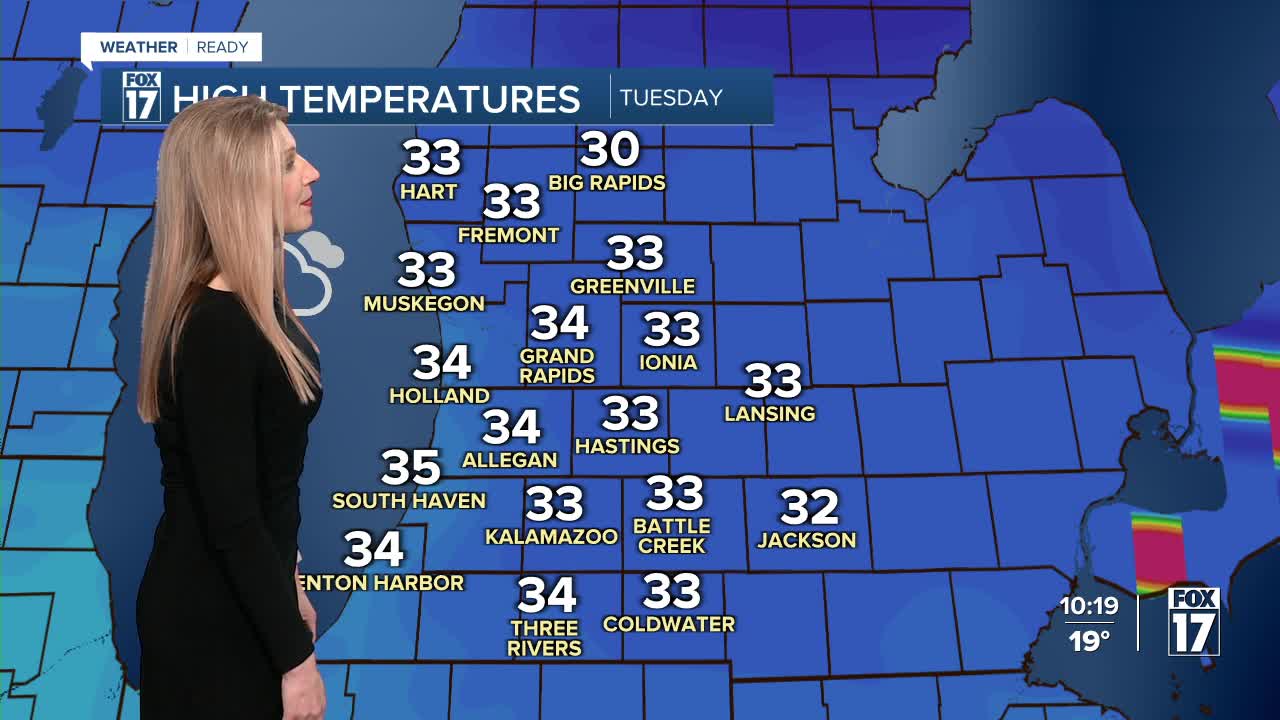 The forecast from FOX 17 Meteorologist Kara James: Snow showers will be winding down tonight along the lakeshore, but isolated lake effect is possible south of South Haven. The rest of West Michigan will be partly cloudy and very cold overnight, with lows in the mid-teens. The wind will relax tonight, but wind chills will still be a few degrees colder than actual temperatures. A clipper system tracking mainly north into Canada will bring another round of light snow tomorrow afternoon into Wednesday morning, mainly from Grand Rapids northward. We expect about 1" to 2" in these areas, with isolated higher amounts around 3" possible across Oceana, northern Newaygo, and Mecosta Counties and around half an inch from I-96 south. The rest of the work week will be mainly dry, with the warmest day Friday in the mid-40s. Saturday night into Sunday the next system arrives, with the chance for snow showers and continued colder air. Longer range temperature outlooks still keep Michigan in at/above normal readings into the first full week of March. Normal highs are in the mid 30s, so no Arctic air is on the horizon or big storms at this time.
