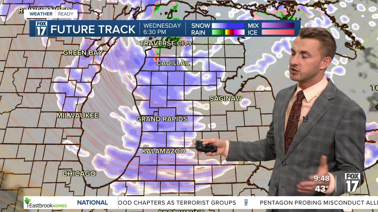The forecast from FOX 17 Meteorologist Reece Cole: Big changes are brewing in West Michigan's weather this week of Thanksgiving! A system moving in from the southwest brings scattered rain showers throughout Tuesday, becoming more isolated in the afternoon. Colder air arrives with a secondary low early Wednesday morning, with temperatures dropping to the 30s, changing rain to snow and even igniting lake effect snow. Colder air will move into the region later Wednesday into Thanksgiving, with scattered snow showers. Expect slippery travel conditions at times Wednesday afternoon through at least midday Thursday. Accumulations look between 2" and 5", but with strong winds, low visibility and wind chills in the teens, this will be a true taste of Winter weather. There is also the potential for yet another system to bring widespread snow to the region this weekend. Looking ahead into the first week of December; a "colder than average" pattern shift is ahead. Stay tuned to the FOX 17 Weather Ready Team for your latest forecast.