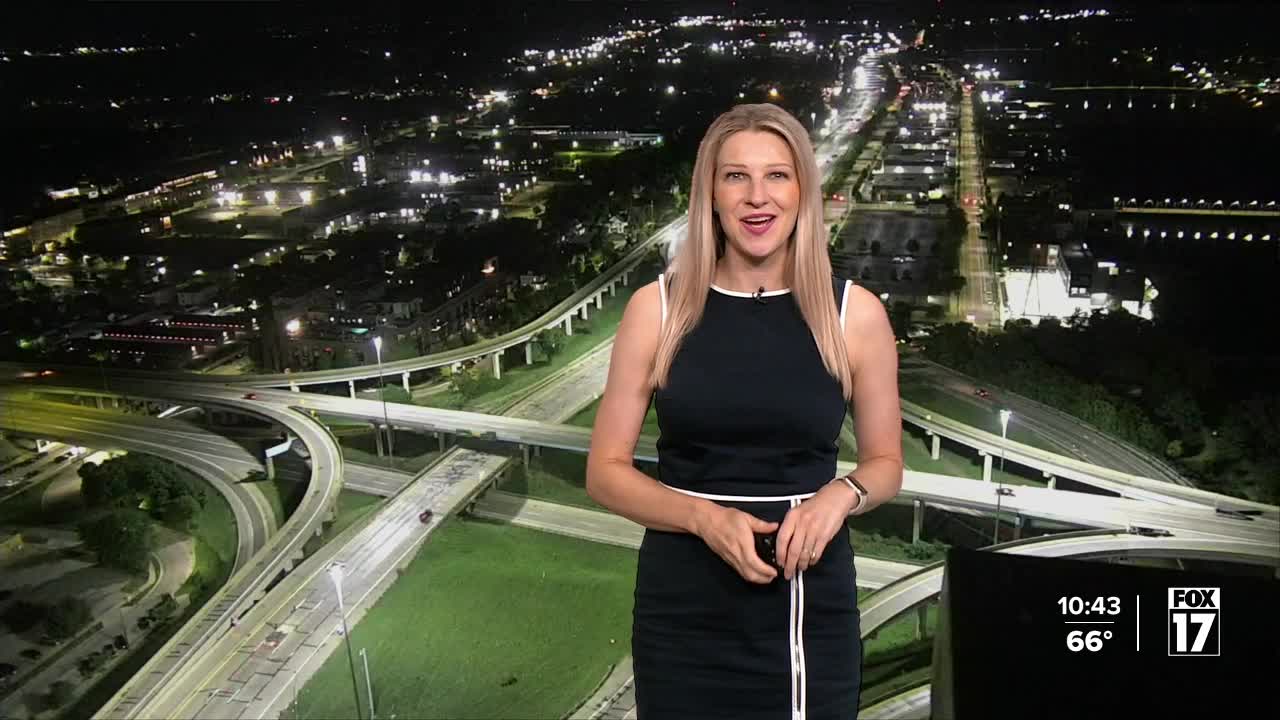 The forecast from FOX 17 Weather Ready Meteorologist Kara James: The big story is clearing skies and dry air into the end of the work week. Dew points will gradually drop into the 50s for the rest of the week and into the weekend, as sunshine and low 80s prevail. The next best chance for rain will come with another front on Saturday, which will produce a few light showers or thundershowers and usher in a "Fall preview" for the following week! Highs may be stuck in the upper 60s! In fact, we'll have the chance of some lake effect rain showers on Sunday and Monday as colder air comes across the warmer water of Lake Michigan. There may be a waterspout or two, too! On the tropical front, we are tracking Hurricane Erin. Stay tuned to the FOX 17 Weather Ready Team for your latest forecast updates.