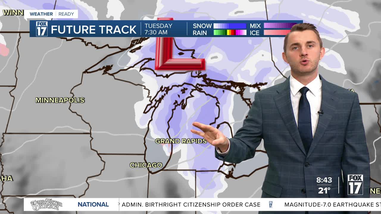 From Fox 17 Weather Ready Meteorologist Reece Cole: Another wave of light snow is passing through West Michigan this morning, bringing 1" to 2" of new snow through midday Sunday. Watch for slick roads this morning, as temperatures start in the middle 20s. Areas along I-94 will see the highest totals today. As snow ends, some sunshine will break through this evening. High pressure calms our winds as we clear, meaning tonight temperatures will fall well into the single digits and near zero for some! Highs Monday will only be in the low 20s, too. The overall pattern remains unseasonably cold and active, with a more significant system taking shape for next Tuesday and Wednesday. We could see a handful of inches of snow this week, as well as some rain mixing Wednesday which could slush things up before refreezing Wednesday night!