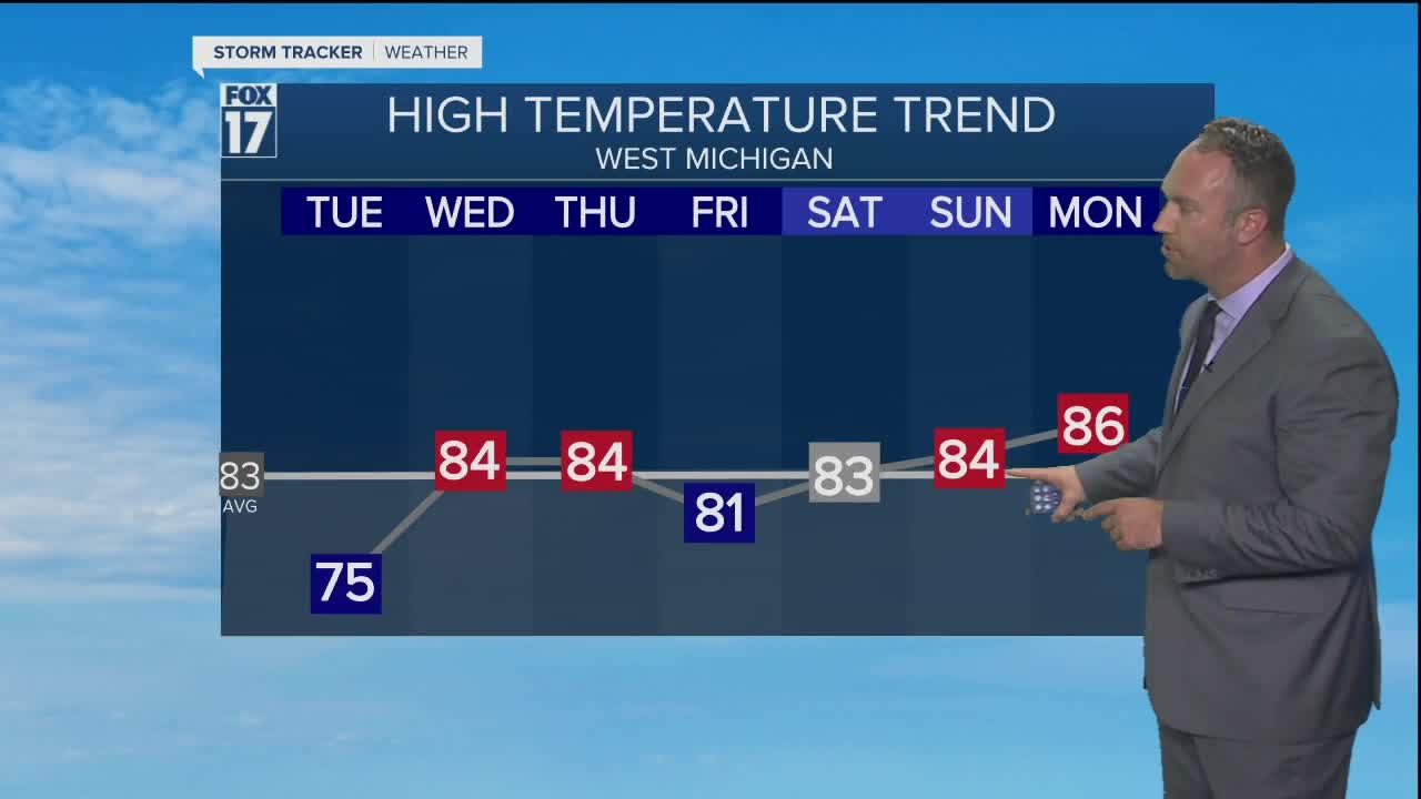 WEST MICHIGAN — The forecast from FOX 17 Meteorologist Anthony Domol: Tuesday brings a better chance for scattered showers and thundershowers as a warmer and more humid air mass pushes into the region along with the passage of an upper-level disturbance. As one storm system departs and another approaches, Wednesday stays dry before a renewed chance at wet weather arrives Thursday. Skies look much drier by next weekend, with partly cloudy to mostly sunny skies and warm temperatures in the low to mid 80s.