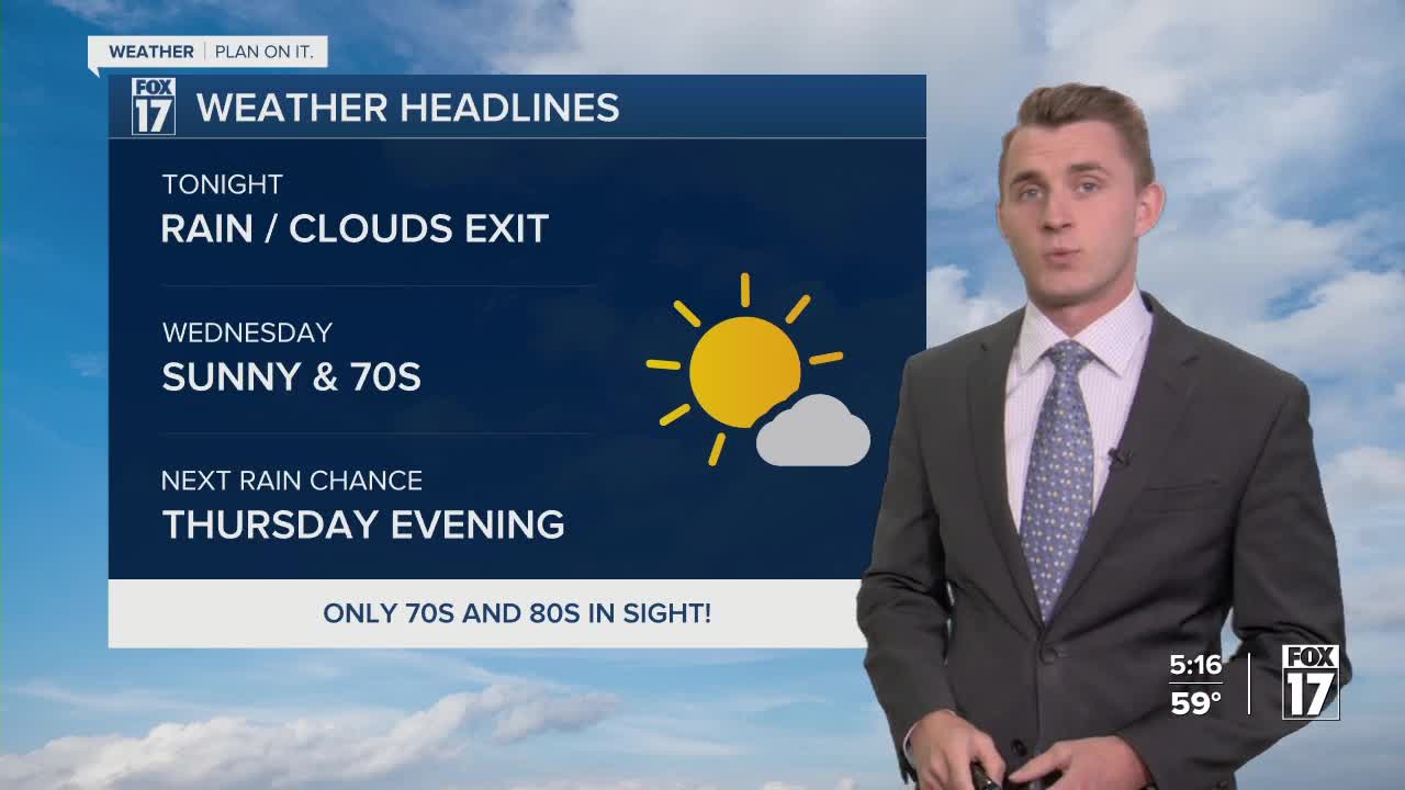 The forecast from FOX 17 Meteorologist Reece Cole: Showers continue to gradually shift to the south this evening and overnight. temperatures will drop back to the 40s north of Grand Rapids under clear skies, and lower 50s in our southern communities. Rain will be completely out of West Michigan by early Wednesday. This sets us up for sunshine and highs back in the 70s for the middle of the week. We remain in the 70s for the foreseeable future, with some 80s possible too! Our next chance of rain arrives Thursday evening, and maybe a few thunderstorms Friday morning.
