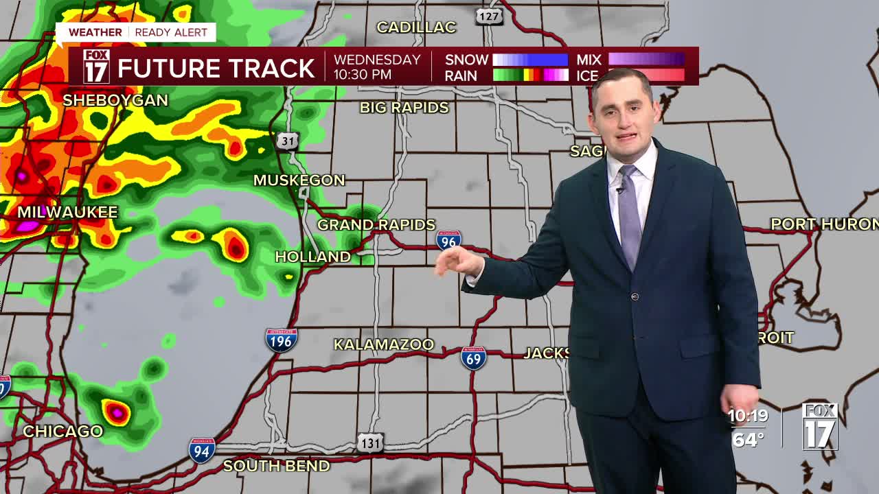 The forecast from FOX 17 Weather Ready Meteorologist Kara James: Our active weather week continues with rain and thunderstorm chances again overnight and tomorrow. There is a threat for a few strong to severe storms through the early morning, with damaging winds as the main threat. West Michigan is in a MARGINAL RISK (Level 1 out of 5) south of I-96 for severe storms. Grand Rapids northward is not under a severe weather outlook. There is a WEATHER READY ALERT tonight to account for the severe weather threat. Damaging wind gusts are the main threat , along with flooding rain. River levels will keep rising, and will stay elevated through next week. A Flood Watch has been issued for the ENTIRE STATE of Michigan until early Friday morning with another 1" to 2" of rain on the way. More rain and storms are likely on Saturday as a cold front pushes through and ends this active stretch.