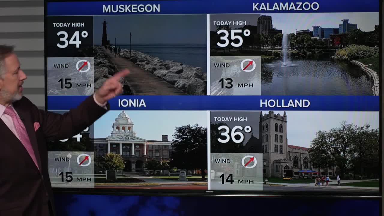 TODAY: Partly sunny to mostly cloudy with snow showers. Less than an inch, except in Muskegon and Oceana Counties. A moisture feed off Lake Michigan may generate 2" to 3" in those areas. Warmer too! Highs in the mid/upper 30s. Winds south/southwest at 10 to 15 mph.