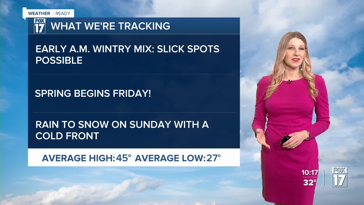 The forecast from FOX 17 Weather Ready Chief Meteorologist Kevin Craig: Some light snow showers may occur today in West Michigan. This will be light with totals less than an inch. After that moves away, the rest of today is mainly with highs in the mid 30s. Starting Thursday and into next week, a return to warmer and quieter weather happens just in time for the official start to Spring on Friday! It's what we call the vernal equinox and officially arrives at 10:46 A.M.. It's the exact time the sun is directly overhead of the equator. It also marks the start of Fall for the southern hemisphere. Since this is SEVERE WEATHER WEEK, there will be a STATEWIDE TORNADO DRILL at 1 P.M. today. Listen for the sirens to sound, although since this is a voluntary effort, not all local and state municipalities may participate.