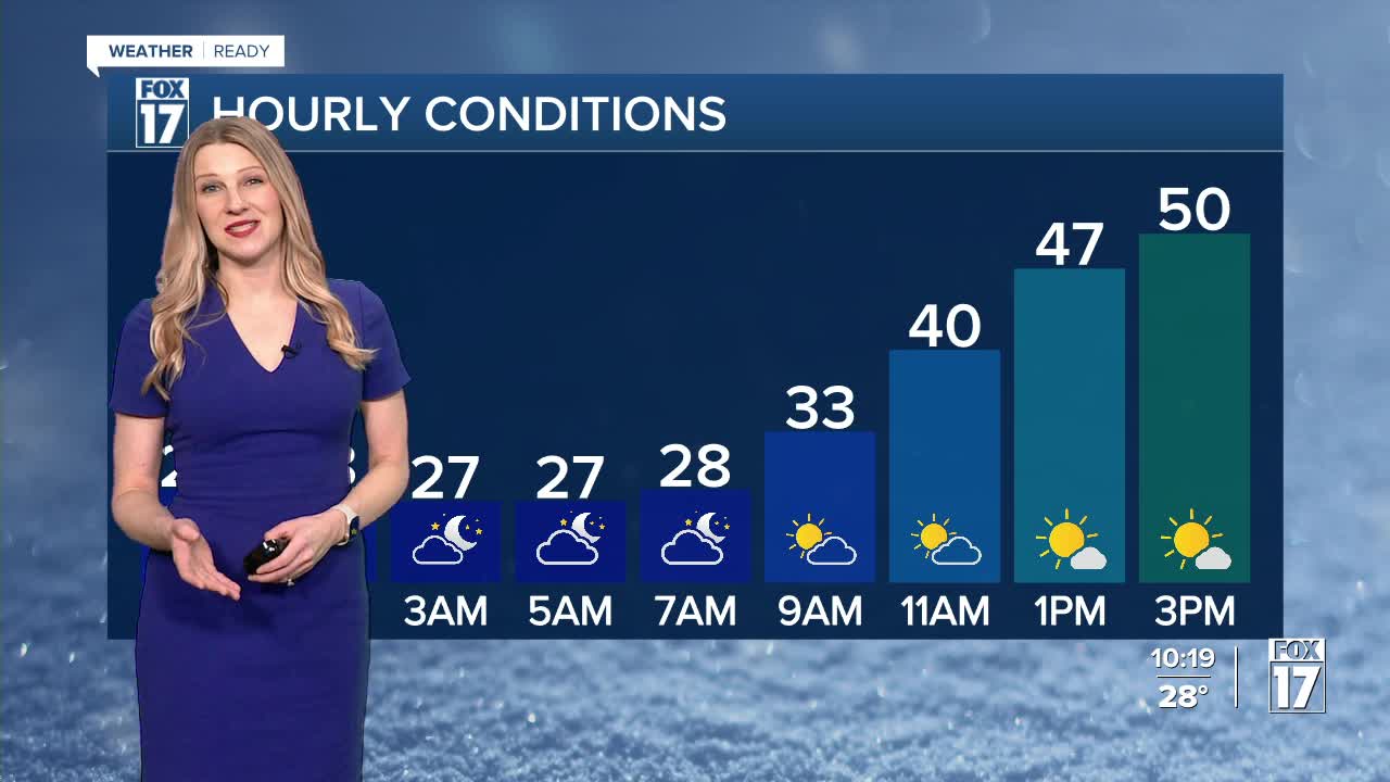 The forecast from FOX 17 Weather Ready Meteorologist Kara James: Overnight will be mostly clear and chilly with lows in the upper 20s. Tomorrow will be the warmest day of the week with highs in the low 50s and sunshine, but with a stiff breeze it will not feel as warm as last week. Saturday evening/night our next weather system arrives, with the chance for snow showers and reinforcing colder air. A widespread 1-3" is expected, with mainly accumulations on elevated and grassy spots. Roads could be a little slick in spots, but no major travel disruptions. Cold air lingers Sunday and Monday with a mix of sun and clouds, but warmer air starts to nudge in by mid next week. It will also become more active, with several chances for rain or a rain / snow mix. Longer range temperature outlooks still keep Michigan in at/above normal readings into the first full week of March and perhaps beyond. Normal highs are in the mid 30s.