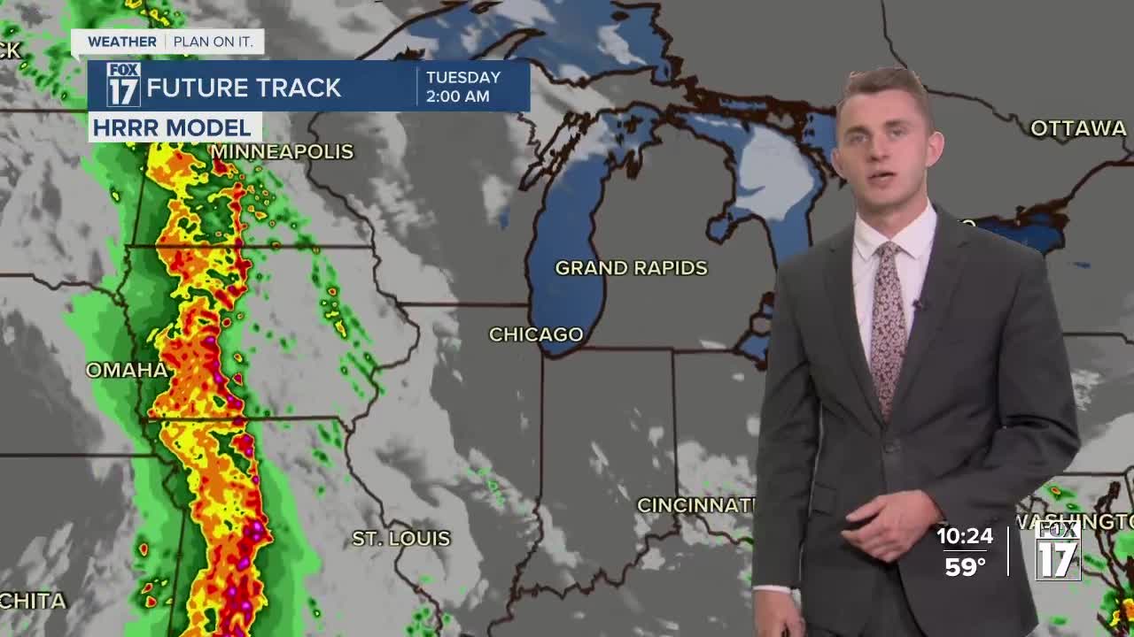 WEST MICHIGAN — The forecast from FOX 17 Meteorologist Reece Cole: Mostly clear skies tonight, as temperatures fall back to the upper 40s around 50 degrees. We see high clouds move in early Tuesday, with thicker clouds through the mid morning, ahead of our next rain maker. Strong to severe thunderstorms will be possible Tuesday afternoon and evening. Hail, wind, and an isolated tornado can't be ruled out. Click here for more information about Tuesday's severe weather potential. Pop-up showers will be possible late Wednesday night, with more widespread rain on Thursday. Stay alert with the FOX 17 Weather Team.