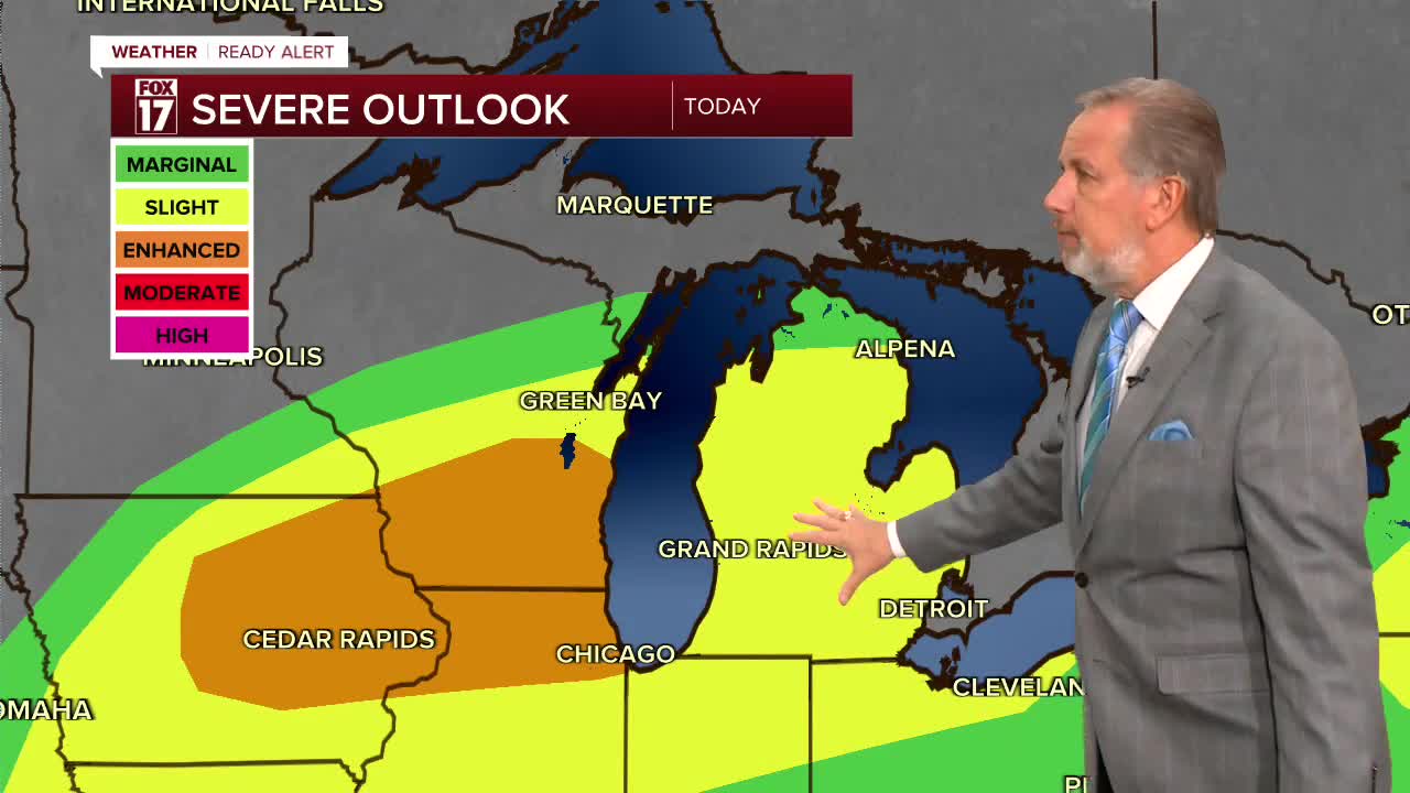 The forecast from FOX 17 Weather Ready Chief Meteorologist Kevin Craig: An active week continues in West Michigan with rain and thunderstorm chances each day through Thursday. The threat for strong to severe storms is there each day as well, and West Michigan is in a Slight Risk (Level 2 out of 5) for severe storms today and tonight. There is a WEATHER READY ALERT for today and tomorrow to account for the severe weather threat. we remain is a severe weather threat also for Wednesday with a threat level 1/5. The best chance for severe storms will occur this evening and early overnight. Gusty winds and large hail are the main storm threats, in addition to heavy rain and flooding, but an isolated tornado can't be ruled out. Rain and thunderstorm chances continue Wednesday, with lesser chances on Thursday. River levels will rise again and some flooding is expected throughout the week. A Flood Watch has been issued for Oceana, Newaygo and Mecosta counties until Wednesday morning.