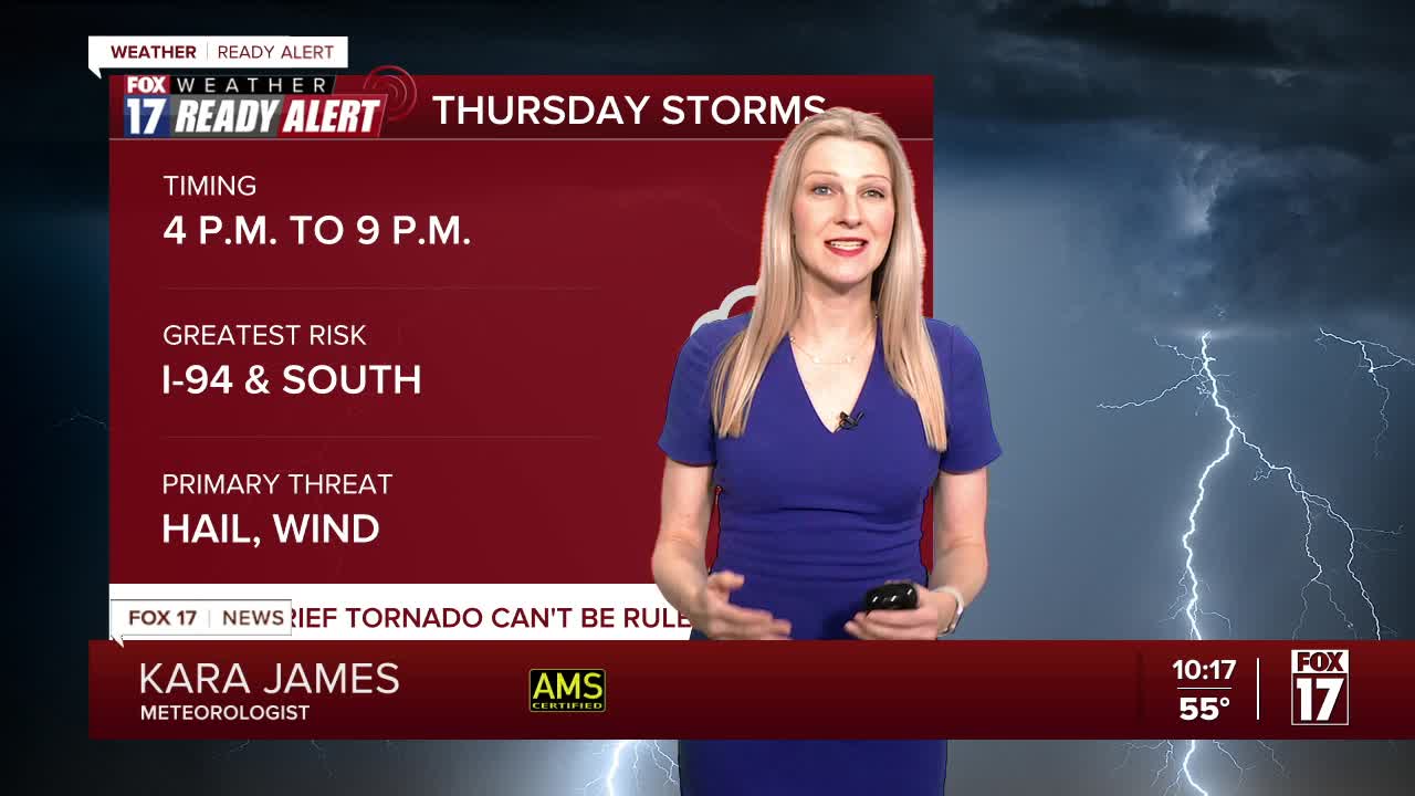THURSDAY: FOX 17 WEATHER READY ALERT DAY! Partly sunny to mostly cloudy and unseasonably warm with P.M. and nighttime showers and thunderstorms. Some storms may be strong severe with wind, large hail, or an isolated tornado, mainly from Grand Rapids southward. Highs in the low/mid 60s. Winds variable at 5 to15 mph.