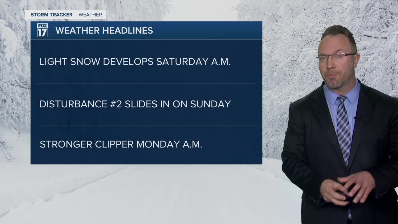 WEST MICHIGAN — The forecast from FOX 17 Meteorologist Anthony Domol: Clouds return Saturday morning before a cold front sweeps through, producing light snow showers. Locations along and north of I-96 have the best chance of seeing 1 to 2 inches of snow accumulation, with less than an inch south of I-96. Winds will also be a key factor on Saturday, producing blowing and drifting snow, along with reduced visibility. Winds will range between 10 to 20 mph from the southwest/west, with wind gusts exceeding 30 mph. Additional snow showers move in for Sunday and Monday. As of now, Monday brings the best chance for widespread snow accumulation. The highest totals look to be along the lakeshore. Stay tuned for updates on snow totals! Bundle up, stay safe and warm.