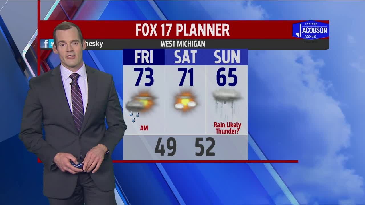 WEST MICHIGAN — The forecast from FOX 17 Meteorologist Ty Shesky: Low pressure will move across northern Michigan overnight into Friday morning, dragging a cold front through. This front will bring another round of rain with embedded thunderstorms overnight into early Friday. After the front clears the area, look for increasing sunshine on Friday along with seasonably warm temperatures to begin the weekend.