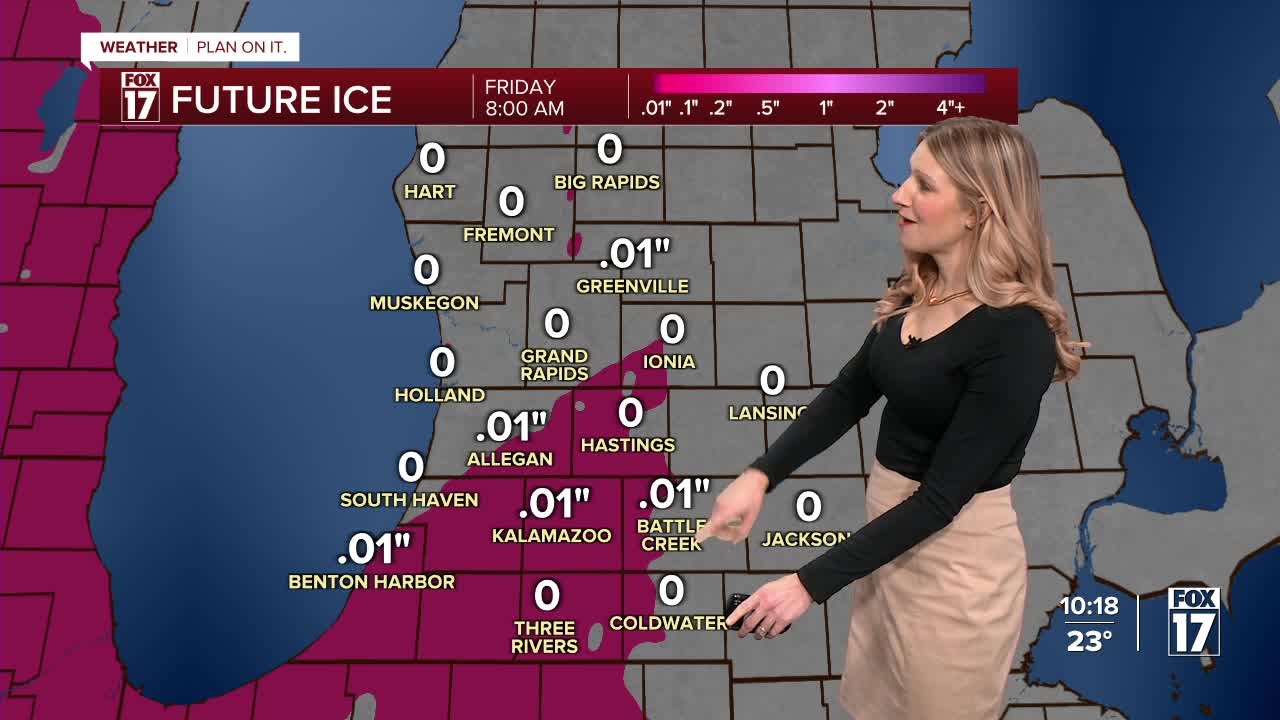 WEST MICHIGAN — From Fox 17 Weather Ready Meteorologist Kara James: A WINTER WEATHER ADVISORY is in effect until 1PM Friday, for slick travel from light freezing drizzle and low visibility due to widespread snow. A batch of freezing drizzle is possible late this evening and overnight, so expect the potential for hazardous travel conditions. Another round of widespread but heavier snow early tomorrow morning will cause slick spots for the morning commute, adding 1-2" of snow areawide. Dry air returns tomorrow afternoon. Friday's temperatures will climb into the low 30s by midday and will drop into the 20s during the afternoon. Wind chills could be as low as -5 by 4 p.m. Friday. Another Arctic blast kicks off this weekend, with Saturday morning's temperatures just a little above zero and highs in the teens. Occasional snow showers will be possible this weekend, but much of the time will remain dry. Warmer weather returns next week.