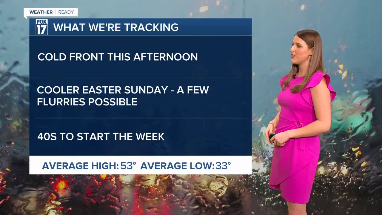 WEST MICHIGAN — The forecast from FOX 17 Weather Ready Meteorologist Gracyn Freund: Showers and thunderstorms continue moving through the area this morning. While West Michigan was under a Marginal risk for severe storms overnight, that threat has now shifted off to our east for today. However, a few storms early this morning could be on the strong side and produce gusty winds and heavy downpours, enough rain to create flooding in prone areas. Rain and storms will gradually end Saturday afternoon but rain totals could add up to 1-2". Temperatures will be in the upper 50s to lower 60s Saturday. For Easter Sunday, we will be mostly dry outside of a few flurries or sprinkles. Highs will be in the lower 40s, and it will be breezy. Next week, a weak system could bring a few rain/snow showers Monday but a warm-up is coming by the end of the week.