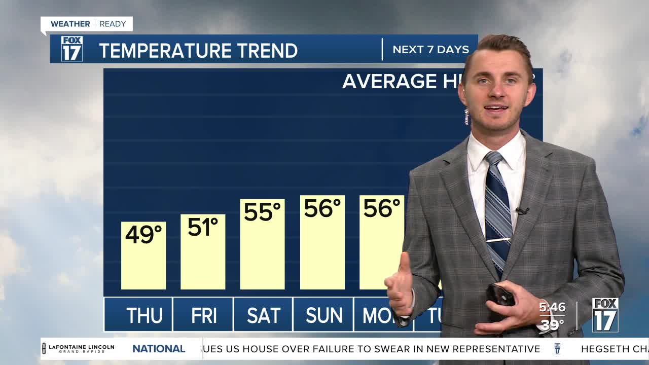 The forecast from FOX 17 Weather Ready Meteorologist Reece Cole: Scattered showers and a cool wind continue from the cut off low over Lake Huron into Thursday. Lake effect and lake enhanced rain showers won't end until early Friday. The coldest air of the season remains, only reaching the upper 40s to near 50 along with a stiff 15 to 20 mph breeze. Feels like temperatures Thursday and Friday will be in the low/mid 40s. A strong high pressure system moves in for the weekend, keeping us clear and pleasant. Our first freeze is possible Saturday morning. Cover the plants or bring them indoors! Stay with the FOX 17 Weather Ready Team for your latest forecast updates.