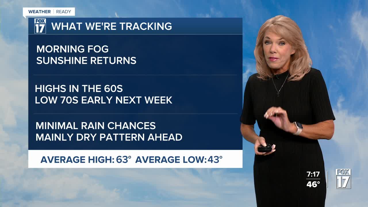 WEST MICHIGAN — The forecast from FOX 17 Weather Ready Meteorologist Terri DeBoer: A DENSE FOG ADVISORY is in effect until 10AM, as patchy fog is developing across West Michigan this morning. The fog will dissipate quickly, with more sunshine returning to close out the weekend. The stubborn cloud deck on Saturday kept a lid on temperatures; with an official high only reaching 59-degrees. That was the coolest afternoon high temperature since May 23rd! With more sunshine, temperatures will climb into the mid to upper 60s this afternoon. Widespread frost is not a concern for the next several days, as morning temperatures will hold in the 40s through much of the week. Slightly warmer air is on the horizon for the beginning of the week, with afternoon highs approaching the 70-degree mark for Monday and Tuesday. Unfortunately, most of the Lower Peninsula remains in a moderate to severe drought, and only isolated rain chances are possible toward the end of next week. Stay with the FOX 17 Weather Ready Team for your latest forecast updates.
