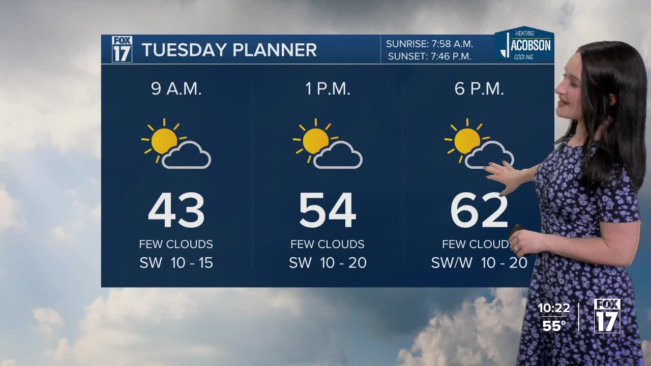 WEST MICHIGAN — The forecast from FOX 17 Meteorologist Haleigh Vaughn: A few clouds are in the forecast for tonight, along with mild temperatures. Our wave of warmth extends into Tuesday and Wednesday, with high temperatures in the lower 60s. Tuesday will feature a mix of sun and clouds, while Wednesday features a slight shower chance south of I-96. Most of the region will remain dry and partly cloudy on Wednesday. A system is set to track into West Michigan on Thursday and Friday, bringing widespread rain showers. A few light sprinkles are possible late Saturday night and Sunday, with a mix of rain and snow possible next Monday. Stay up to date with the FOX 17 Weather Team.