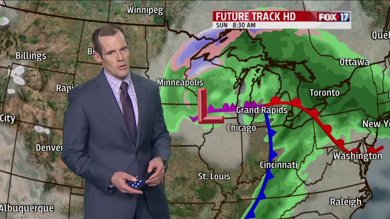 WEST MICHIGAN — The forecast from FOX17 Meteorologist Ty Shesky: Clouds will quickly thicken this evening and showers will develop ahead of an approaching warm front and associated area of low pressure in the central Plains. This front will continue to reside to our south on Saturday, keeping showers possible with some rumbles of thunder possible. As this warm front clears at least the southern third of the forecast area on Saturday night, temperatures will continue to climb and it could be unstable enough for a few strong to severe storms. The best chance of that will be along I-94 and points south. A cold front will clear the area in the wee hours of the morning on Sunday resulting in a windy, cooler, and showery second half of the weekend.
