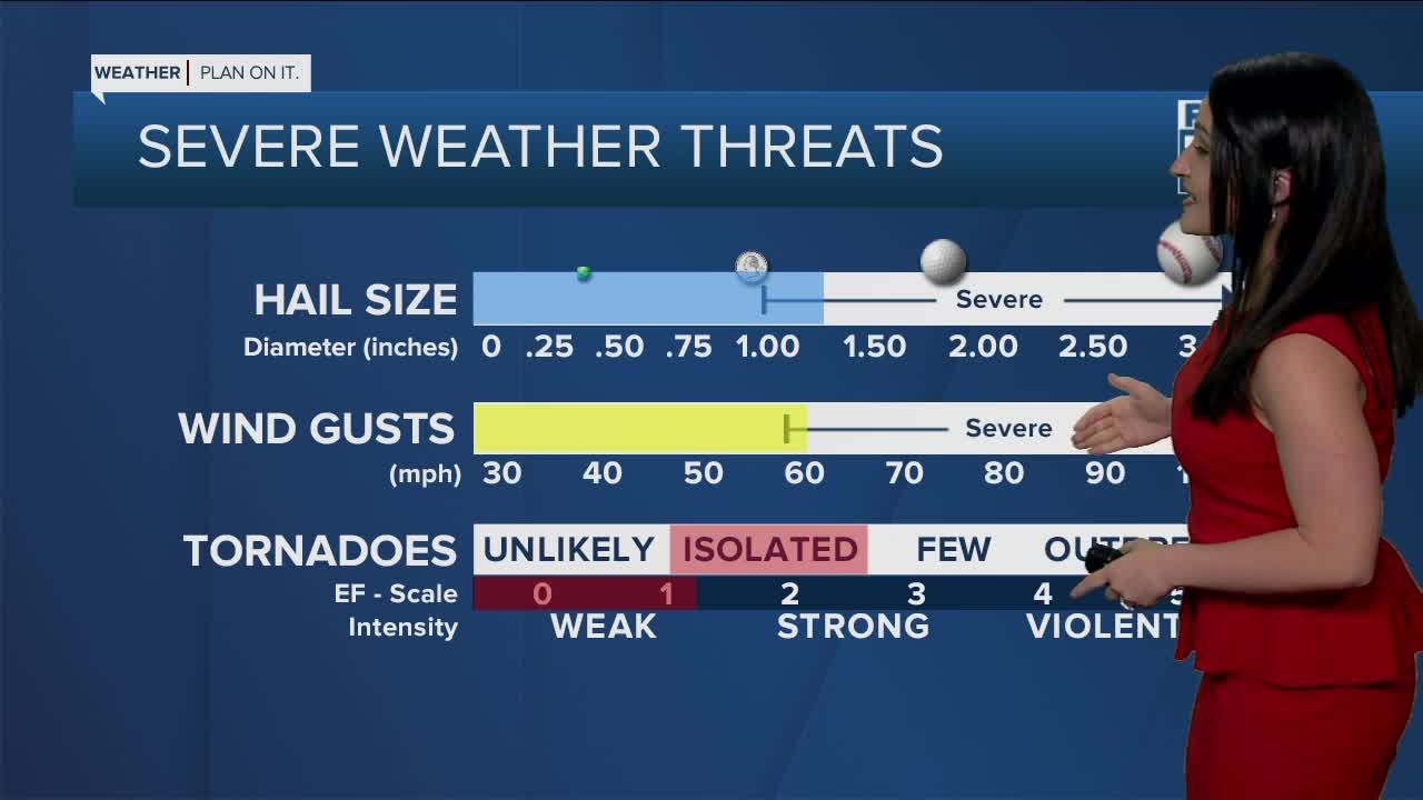OVERNIGHT: Showers and thunderstorms continue. Strong storms possible. Breezy west winds 10 to 20 mph. Lows in the upper 50s.